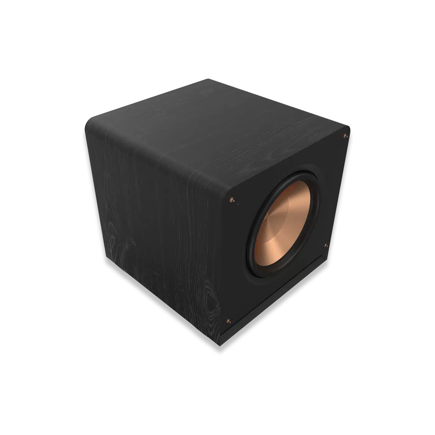 Scratch resistant ebony vinyl finish looks like real wood and covers the entire cabinet. Rounded corners, shock-absorbing rubber feet, steel grille posts and a durable woven cloth grille ensure a premium aesthetic.
